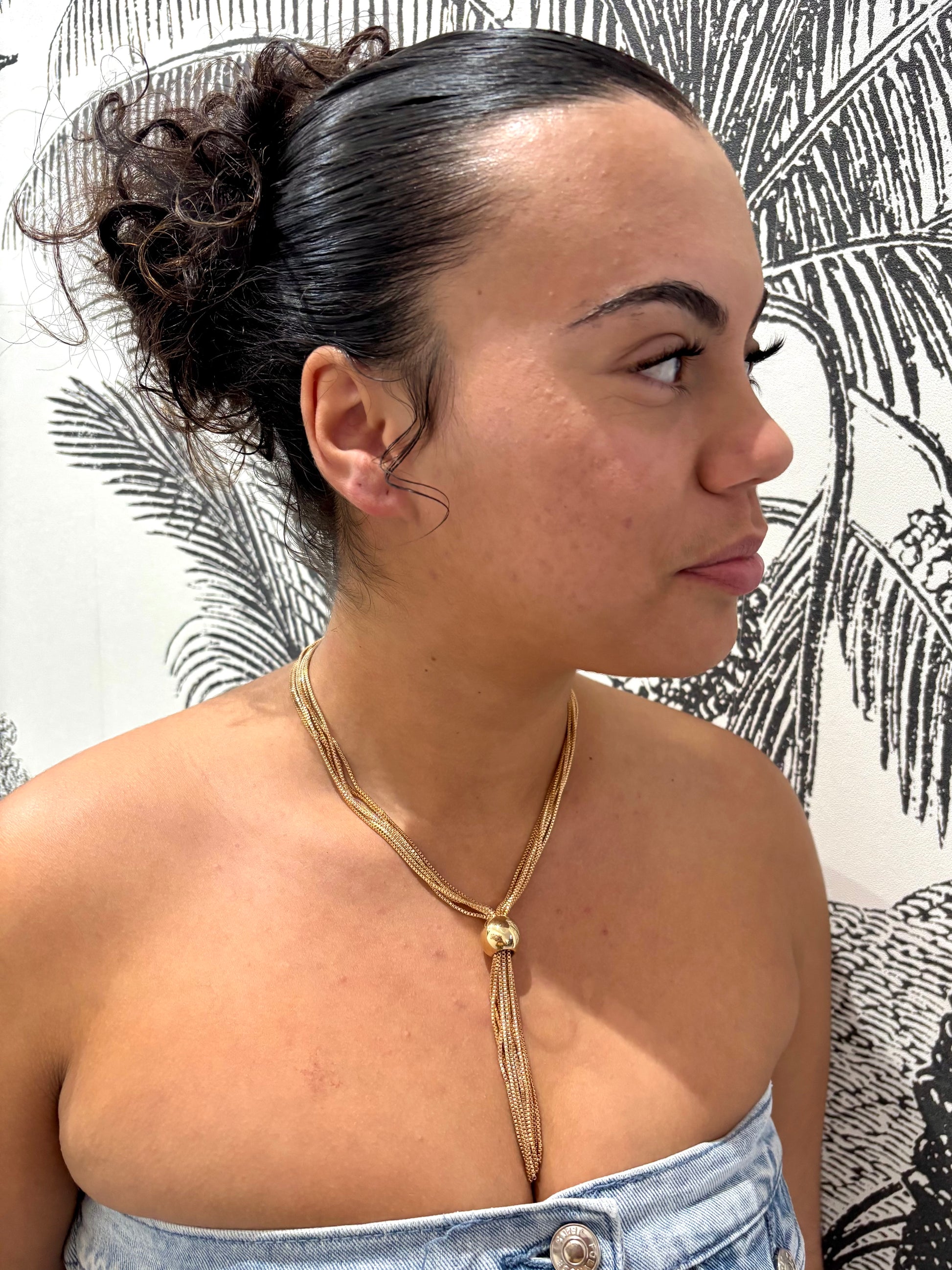 Ce collier raffiné à chaînes multiples et pendentif doré allie modernité et sophistication. Son design fluide et lumineux habille votre décolleté avec une touche glamour, parfaite pour toutes vos occasions.