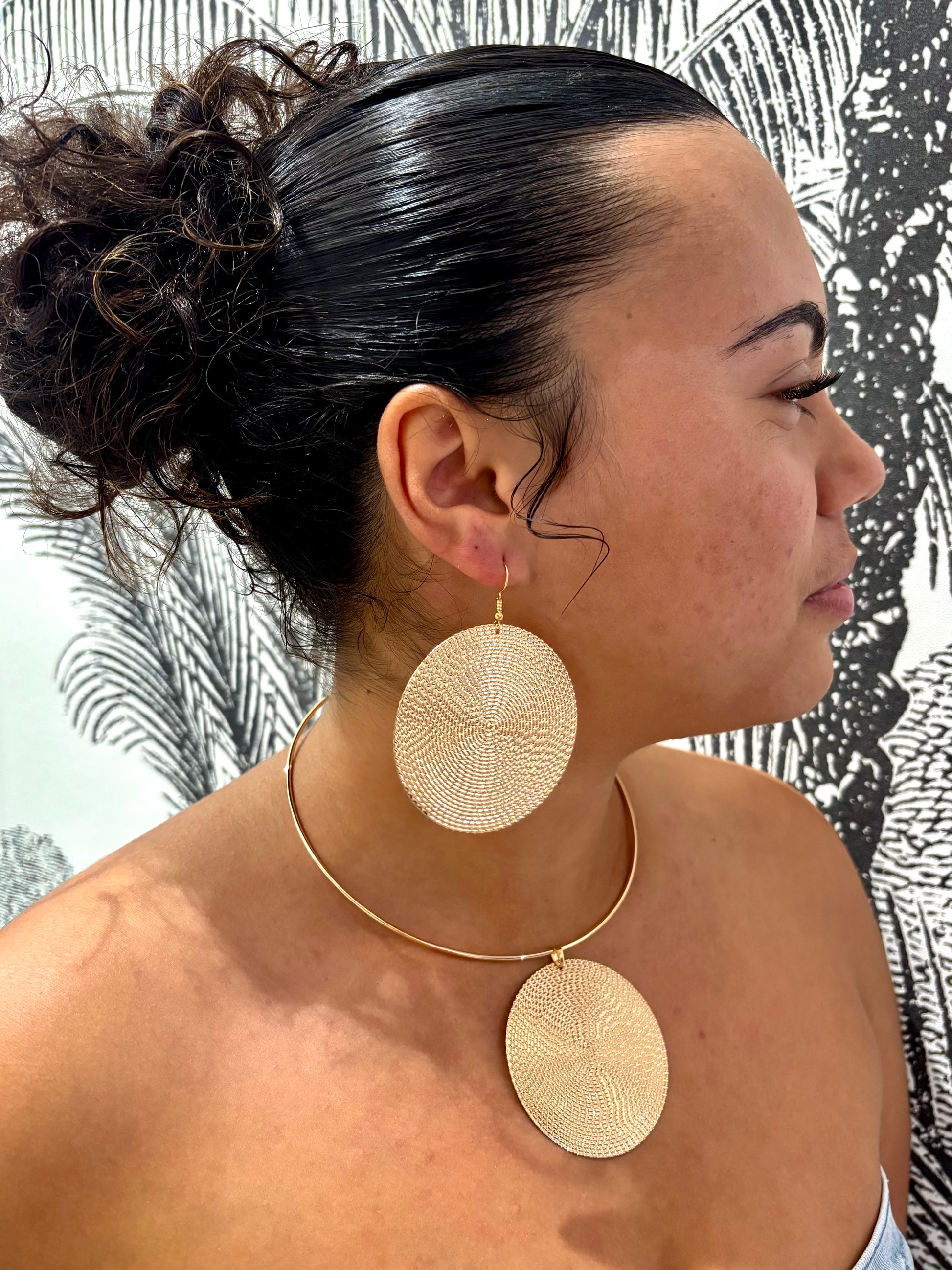 Sublimez votre style avec ce lot tendance composé d’un collier rigide et de boucles d’oreilles assorties, ornés de médaillons texturés dorés. Leur design chic et lumineux apporte une touche sophistiquée à toutes vos tenues, du casual au plus habillé.